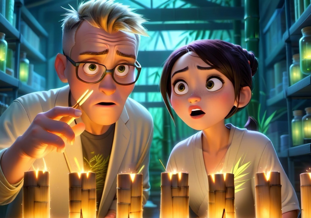 En el fondo del laboratorio, el resplandor cálido de las lámparas de luz solar caía sobre los ejemplares de guadua en varias etapas de evolución. Elestria, la compañera de proyecto de Marcelo, estudiaba las muestras con atención maternal. Se detuvo en uno de los prototipos. Sus dedos recorrieron los suaves contornos de la fibra. El material respondió con una resonancia lumínica sutil a su tacto. Desconcertada, Elestria se acercó para estudiarla mejor.