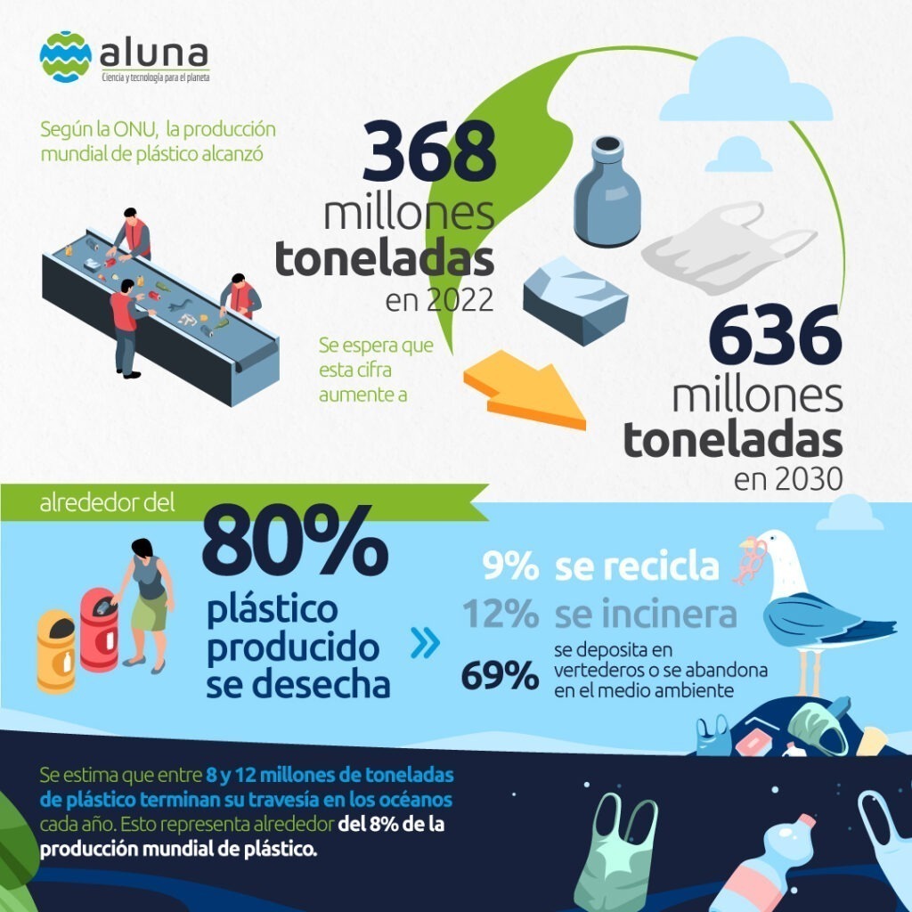 En el escenario global, aterradores números se alzan como testigos silenciosos de una crisis ambiental urgente: Según la ONU, la producción mundial de plástico alcanzó los 368 millones de toneladas en el 2022. Se espera que esta cifra aumente a 636 millones de toneladas para el 2030. Un estudio conjunto de numerosas universidades estadounidenses calculó que alrededor del 80% del plástico producido se desecha. De este porcentaje, solo el 9% se recicla, el 12% se incinera y el 69% se deposita en vertederos o se abandona en el medio ambiente. Según el Instituto de Investigación Marina Algalita, que se dedica a cuantificar la cantidad de plástico que flota en el mar, se estima que entre 8 y 12 millones de toneladas de plástico terminan su travesía en los océanos cada año. Esto representa alrededor del 8% de la producción mundial de plástico.